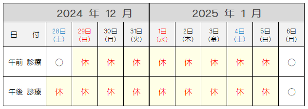 12月29日(木) 午前診療 午後休診 12/30~1/4(全日休診)
